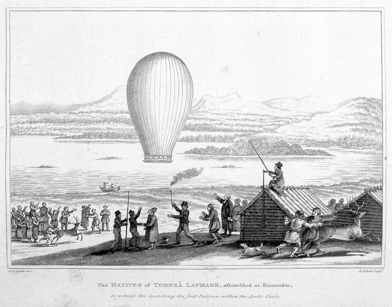 In the summer of 1799, the English traveller Edward Daniel Clarke (1769-1822) and his student John Marten Cripps (1780-1853) travelled through northern Scandinavia to Sápmi. Clarke was eager to encounter and observe the Sámi people and particularly reindeer-herding Sámi. Clarke used local clergymen, whose services the Sámi were obliged to visit, as informants regarding the whereabouts of the Sámi. Clarke also developed a spectacular plan to attract the Sámi. Writing from Torneå to a friend at Cambridge, he explained that he would ‘launch a balloon at the capital of Torneå Lapmark; in order to attract the natives together’. A couple of weeks later Clarke, via the clergyman Eric Grape, sent out notices advertising the launch. When it was eventually launched, the balloon which was described as being ‘seventeen feet in height, and nearly fifty in circumference; and being all of white satin-paper, set off with scarlet hangings’, attracted a large crowd.